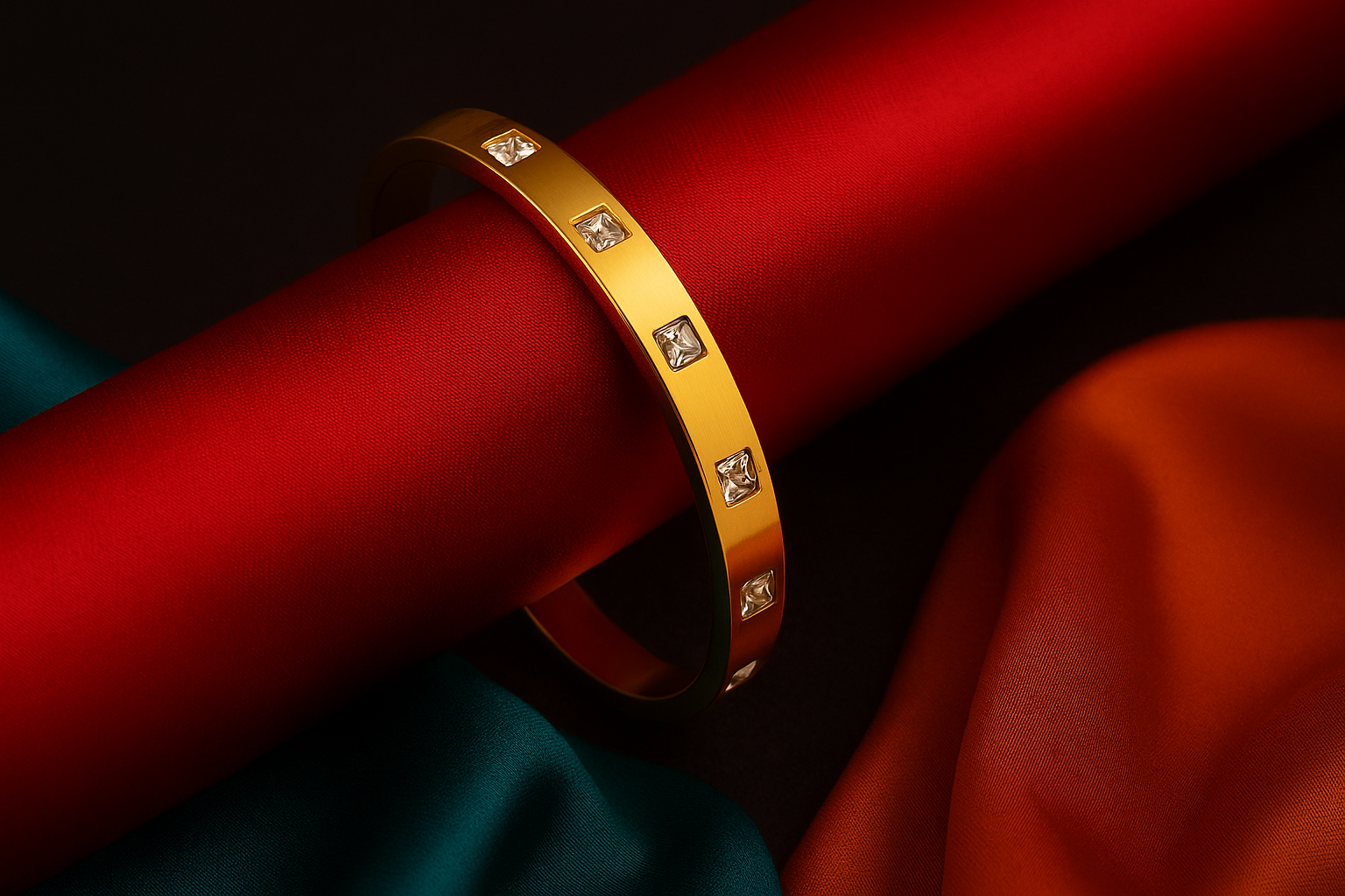 Our Namus Crystal Love Bangle Bracelet, a stainless steel, gold-plated bracelet, beautifully adorned with crystals, adds an exquisite touch of elegance to your casual fits. This ladies' gold bangle bracelet for women effortlessly elevates any look with subtle sophistication, blending contemporary design with timeless luxury. Feminine and versatile, our demi-fine jewellery is ideal for stacking and wearing solo. Its simple yet flawless look is perfect for adding an edge to your outfit.